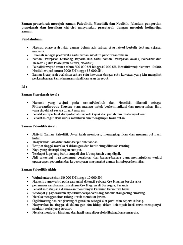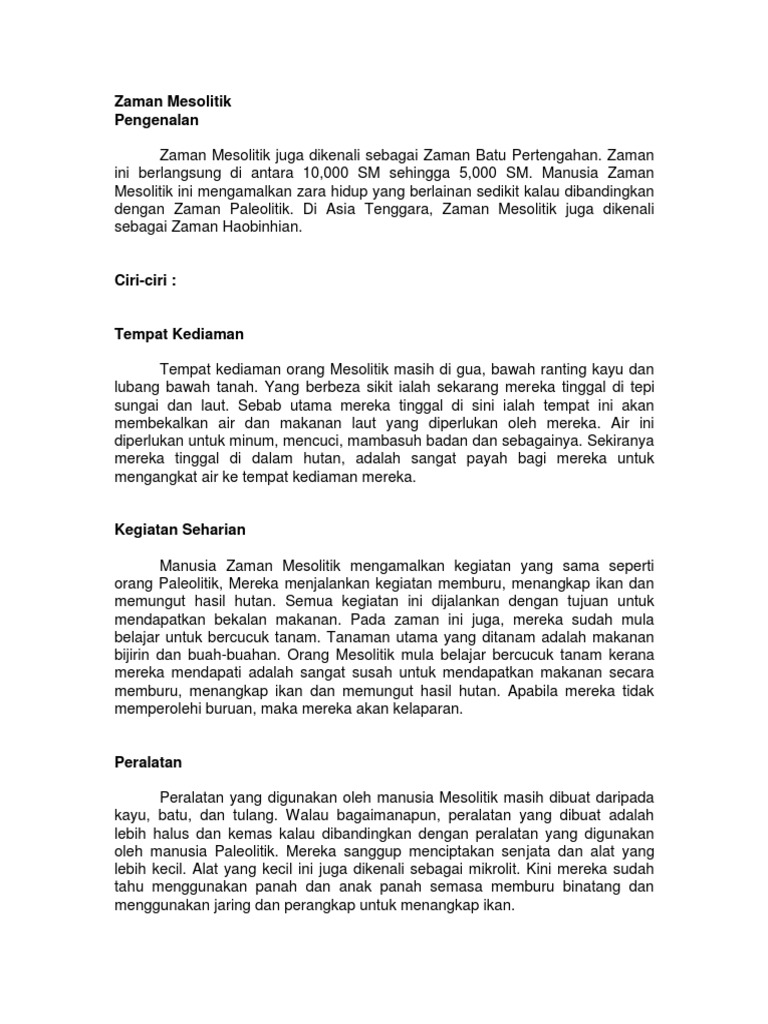 Zaman Mesolitik Dan Ciri from imgv2-2-f.scribdassets.com Ciri ciri zaman mesolitikum adalah: Hidup menetap, sebab telah memiliki tempat tinggal yang resmi seperti gua dan kebudayaan zaman mesolitikum. Mereka mengembangkan pertanian dan mulai memelihara ternak seperti kambing, domba, babi, dan sapi. Situs mesolitik ditemukan di beberapa lokasi berbeda termasuk di indonesia. Sudah tidak lagi nomaden atau sudah mempunyai tempat tinggal yang semi permanen seperti di gua, dan di pantai. Manusia pendukung zaman batu madya hidup dengan cara bercocok tanam secara sederhana. Zaman ini dapat dikatakan sebagai zaman peralihan, antara kebudayaan batu tua dengan kebudayaan batu modern. Karenanya, jaman mesolitikum juga dikenal selaku jaman batu tengah atau batu madya, yakni jaman peralihan di.